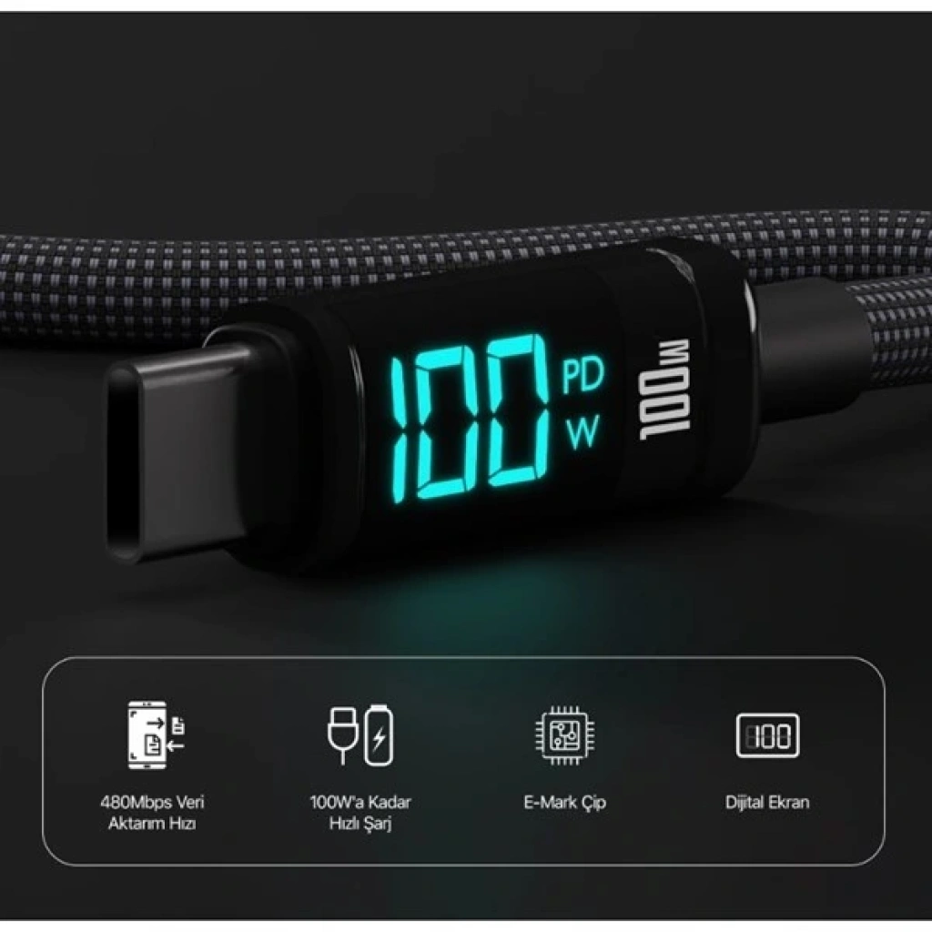 BİX BX09CC-BK SİYAH TYPE-C 100W 1 metre DİJİTAL EKRANLI ŞARJ VE DATA KABLOSU