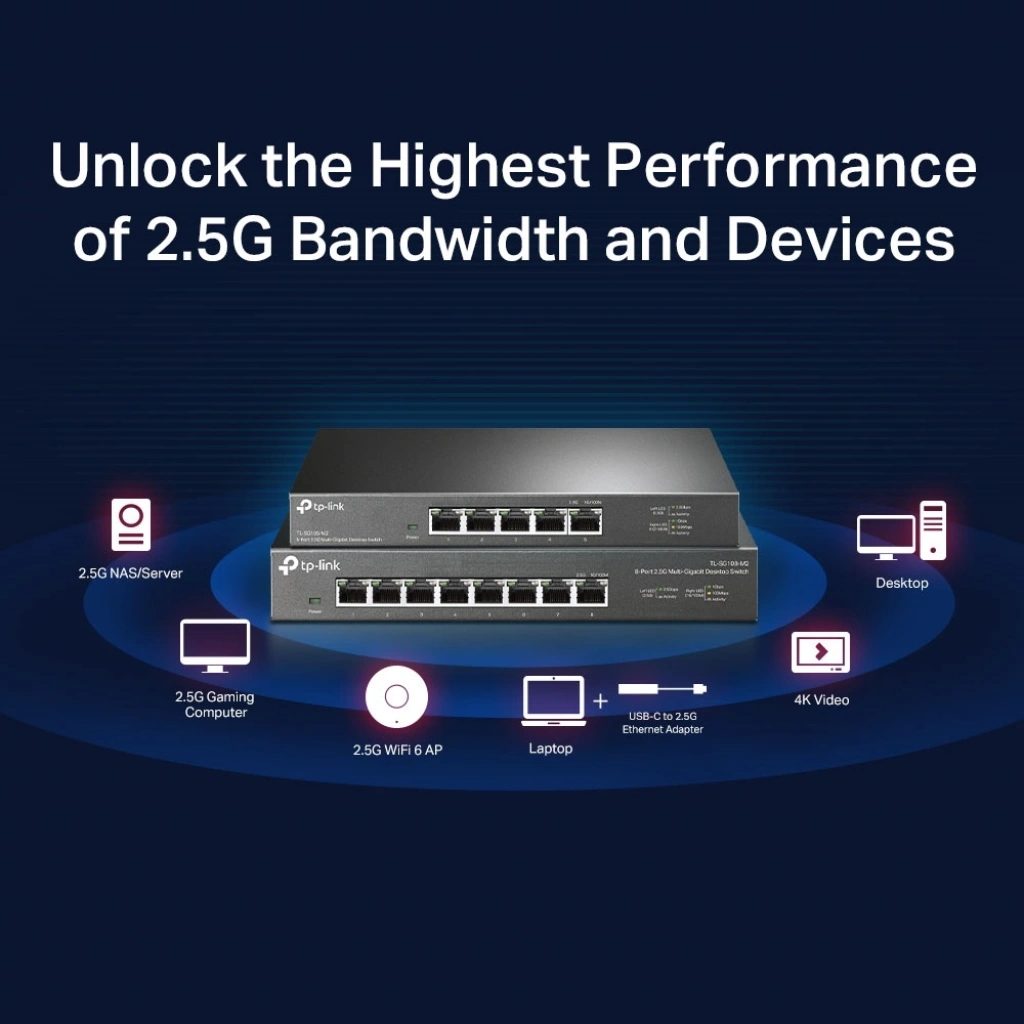 Beş 2.5 Gbps Port. 5x 2.5-Gigabit port, MultiGig bant genişlikleri ve aygıtlarınızın en yüksek performansını ortaya çıkarır ve 25 Gbps'ye kadar switch'leme kapasitesi sunar.